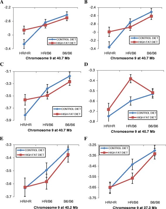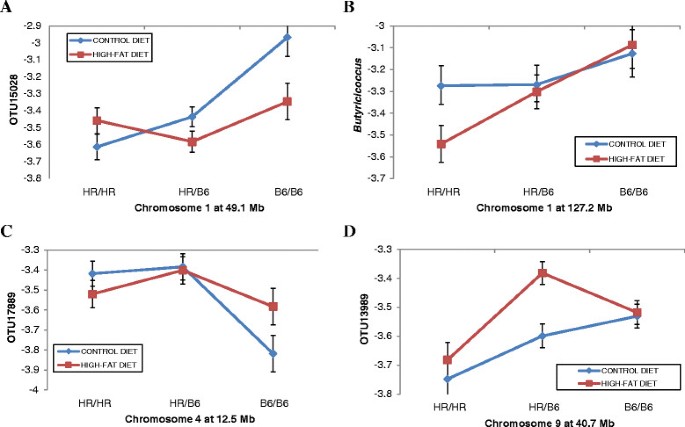 实验目的是解析饮食对宿主遗传调控肠道菌群的修饰作用。方法细节:在QTL定位模型中纳入饮食与QTL的互作项,通过卡方检验评估互作效应的显著性,进一步分析互作QTL在不同饮食组中的遗传效应差异。结果解读:共发现8个菌群QTL与饮食存在显著互作,其中4个位于9号染色体40.7Mb的相同区域,这些QTL对不同菌群的效应具有饮食依赖性:如调控OTU17740的QTL仅在正常饮食组中显著,而调控OTU13989的QTL仅在高脂饮食组中显著;1号染色体的两个QTL也呈现类似的饮食依赖性效应,提示饮食可修饰宿主遗传对肠道菌群的调控作用。
