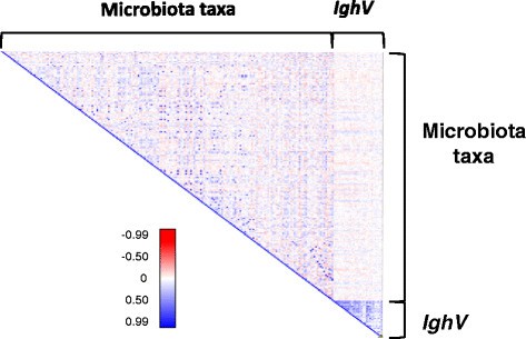 实验目的是明确宿主遗传对回肠IgA可变区利用模式的调控,以及IgA是否介导遗传对肠道菌群的调控。方法细节:通过焦磷酸测序分析回肠组织中IgA的可变区(IghV)利用模式,计算各IghV亚型的相对丰度,使用QTLRel软件定位影响IghV利用的QTL;同时分析菌群丰度与IghV利用模式的相关性,以及菌群QTL与IgA QTL的重叠情况。结果解读:定位到56个影响IghV利用的QTL,其中34个集中在12号染色体的免疫球蛋白重链(IgH)位点区域,2个位于17号染色体的主要组织相容性复合体(MHC)区域,符合IgA可变区重组的遗传调控规律;但未发现菌群QTL与IgA QTL存在重叠,且核心可测菌群的丰度与IghV利用模式无显著相关性,提示宿主遗传对肠道菌群的调控不通过IgA途径介导。