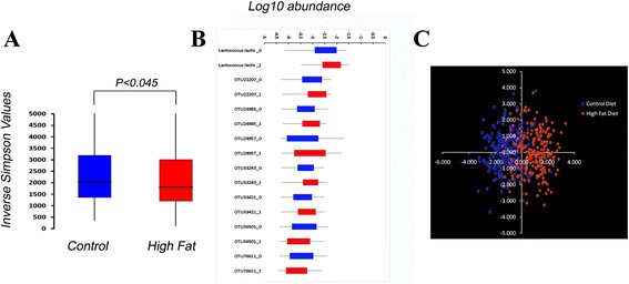实验目的是明确G10小鼠肠道菌群的基本特征,以及高脂饮食对菌群组成的影响。方法细节:采用16S rRNA基因V1-V2区焦磷酸测序分析粪便菌群组成,计算α多样性指数(Inverse Simpson指数),通过方差分析(ANOVA)和线性判别分析(LDA)评估高脂饮食对菌群的影响。结果解读:高脂饮食组小鼠的Inverse Simpson指数显著低于正常饮食组(n=472,P<0.045),提示高脂饮食降低了肠道菌群的多样性;ANOVA分析发现54个操作分类单元的丰度受饮食影响,但经Bonferroni多重检验校正后仅8个操作分类单元的差异达到显著水平;LDA结果显示饮食对菌群的区分效果较弱,仅在第一维度呈现部分分离,表明在遗传多样的群体中,高脂饮食对菌群的影响是多个菌群微小变化的累积,而非少数菌群的大幅波动。