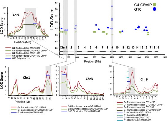 实验目的是定位调控肠道菌群丰度的宿主基因组区域,并验证其在不同世代群体中的重复性。方法细节:使用QTLRel软件对G10小鼠的菌群丰度数据进行QTL定位,采用Haley-Knott区间映射法,纳入加性、显性遗传效应及性别、饮食等协变量;同时将G4小鼠的菌群数据用相同的操作分类单元分析流程处理,重新定位QTL,比较G4与G10群体中QTL的重叠情况。结果解读:在G10群体中定位到42个影响39个操作分类单元丰度的QTL,其中22个达到全基因组5%显著水平,27个为独特QTL;9号染色体37.3-40.7Mb区域存在6个QTL,调控不同菌群的丰度,提示该区域可能存在多效性基因;通过标准化G4与G10的分类学分辨率,发现4个QTL在两个群体中重叠(1号染色体2个,3号、9号染色体各1个),且这些QTL调控的菌群在分类学上相关(如均属于拟杆菌目或梭菌目),证实了这些QTL的可靠性。