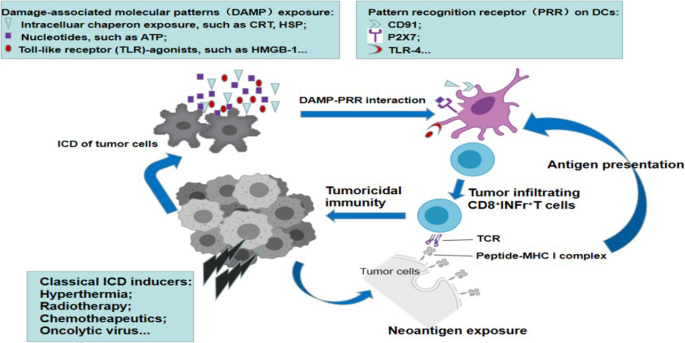 实验目的为增强传统ICD诱导剂的肿瘤靶向性,降低全身副作用,提升ICD诱导效率,进而增强抗肿瘤免疫应答。方法上综述了纳米载体包裹传统ICD诱导剂(如奥沙利铂、阿霉素、紫杉醇)的应用,以及纳米介导的热疗、放疗等物理ICD诱导策略,如PLGA-mPEG纳米粒包裹奥沙利铂,Fe3O4磁性纳米粒介导的磁热疗,金纳米粒介导的光热疗。结果显示纳米介导的ICD诱导可促进损伤相关分子模式(DAMPs)的释放,包括钙网蛋白(CRT)、热休克蛋白(HSP)、ATP、高迁移率族蛋白B1(HMGB1),增强DC细胞的活化与抗原提呈,进而诱导强效的CTL应答,抑制肿瘤生长并产生远隔效应。