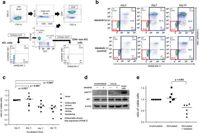 本环节的实验目的是解析idelalisib对ATL细胞存活信号通路的调控机制,重点验证其对CCL22诱导的PI3K-AKT通路的阻断效应。实验方法上,研究人员从ATL患者新鲜PBMC中分离CD4+细胞,经idelalisib预处理30分钟后,采用50μg/ml的CCL22刺激2小时,通过免疫印迹检测AKT在Ser473位点的磷酸化水平;同时选取6例ATL患者的PBMC样本,经CD8+细胞去除后用idelalisib预处理,再加入CCL22培养0-10天,检测细胞增殖情况。实验结果显示,CCL22刺激可显著诱导ATL细胞中AKT的Ser473位点磷酸化,而idelalisib可完全阻断该磷酸化效应;此外,idelalisib可显著抑制CCL22诱导的ATL细胞增殖(n=6,P<0.05,文献未明确具体数值)。实验所用关键产品:PI3-Kinase Activity ELISA kit(Echelon)、Dynabeads(Invitrogen)、Beckman Coulter IOTest Beta mark单抗试剂盒、Annexin V(BioLegend)、Fixable Dead Cell Stain(Thermo Fisher)、CCL22(R&D SYSTEMS)。