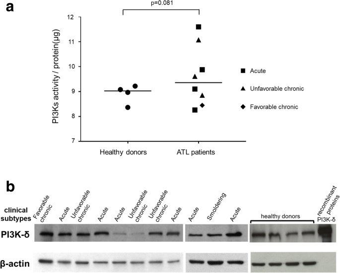 本环节的实验目的是明确ATL患者与健康人群的PI3K通路活性差异,以及ATL细胞中PI3K-δ蛋白的表达特征。实验方法上,研究人员采用PI3-Kinase Activity ELISA试剂盒,对4例健康供体和8例ATL患者的CD4+细胞进行PI3K活性定量检测,细胞分离使用Dynabeads磁珠;同时采用免疫印迹(Western Blot)技术,对11例肿瘤细胞占外周血单个核细胞(PBMC)比例超过75%的ATL患者及4例健康供体的PBMC样本进行PI3K-δ蛋白表达检测。实验结果显示,健康供体与ATL患者的平均PI3K活性无显著差异(n=4/8,P>0.05,文献未明确具体数值),但部分ATL病例的PI3K活性极高;PI3K-δ蛋白在多数ATL病例中可检测到,不同患者间的表达水平存在个体差异。