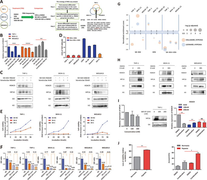 方法细节:通过基因集富集分析(GSEA)筛选联合治疗调控的信号通路;使用缺氧诱导剂DMOG处理KMT2Ar-AML细胞,检测HIF-1α和HDAC9的蛋白表达水平;使用HIF-1α抑制剂BAY 87-2243预处理细胞,检测联合治疗对HDAC9表达的影响;在常氧和缺氧条件下,检测联合治疗对细胞活力和凋亡的影响。