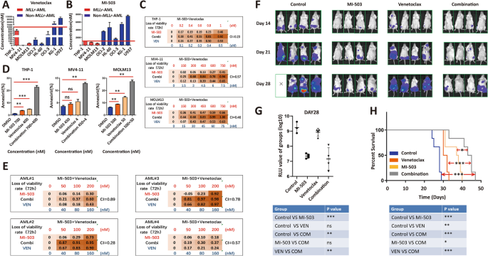 方法细节:选取KMT2Ar-AML细胞系(THP-1、MV4-11、MOLM13)及非KMT2Ar-AML细胞系,通过CCK-8法检测不同浓度维奈克拉、MENIN抑制剂(MI-503、MI-463、VTP-50469)单药及联合处理72小时后的细胞增殖抑制率,使用CalcuSyn软件计算协同指数(CI)评估协同效应;通过流式细胞术检测Annexin V阳性细胞比例,评估不同处理对细胞凋亡的影响;同时纳入原代KMT2Ar-AML细胞、非KMT2Ar-AML细胞及正常骨髓细胞进行离体验证。