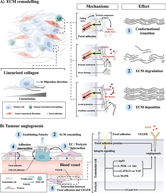 );循环肿瘤细胞通过黏着斑信号抵抗失巢凋亡,如ZNF304通过转录整合素β1促进黏着斑组装,抑制凋亡;在外渗与定植阶段,循环肿瘤细胞通过黏着斑与内皮细胞ECM黏附,诱导内皮屏障破坏,实现远处器官定植。此外,黏着斑还通过正反馈环路促进肿瘤基质重塑,进一步增强转移潜能(