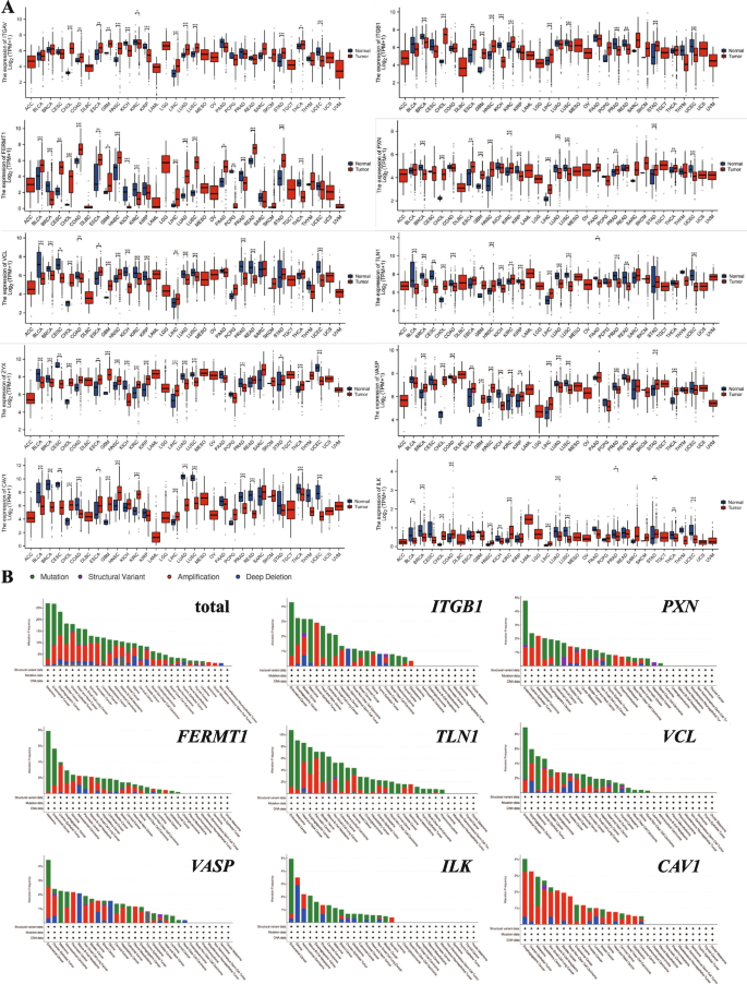 )。整合素作为跨膜蛋白,通过与ECM配体结合将机械信号转化为生化信号,激活FAK/Src激酶复合物,调控细胞骨架重塑。生物信息学分析显示,黏着斑相关基因在多种肿瘤中存在异常表达与突变(