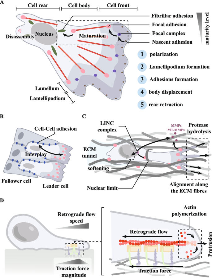 )。在细胞迁移过程中,黏着斑的动态组装与解离调控细胞极性与运动能力,包括单细胞迁移与集体迁移(
