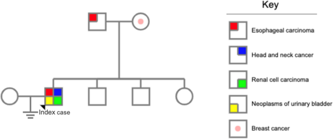 研究人员收集了一名65岁男性患者的临床资料,该患者有40年每日2包香烟、100克酒精的摄入史;家族史显示其父亲55岁确诊食管癌并于60岁去世,母亲50岁确诊乳腺癌并于52岁去世,而患者的两名兄弟和一名姐妹均健康。研究人员通过整理患者的8次肿瘤诊断记录,明确其先后在声带、咽部、肾脏、口底、食管、膀胱等部位确诊8个不同病理类型的原发肿瘤,其中前7个肿瘤均为早期,最后确诊的膀胱小细胞癌在诊断时已出现肝转移,并绘制了患者的家系图以呈现家族遗传背景。