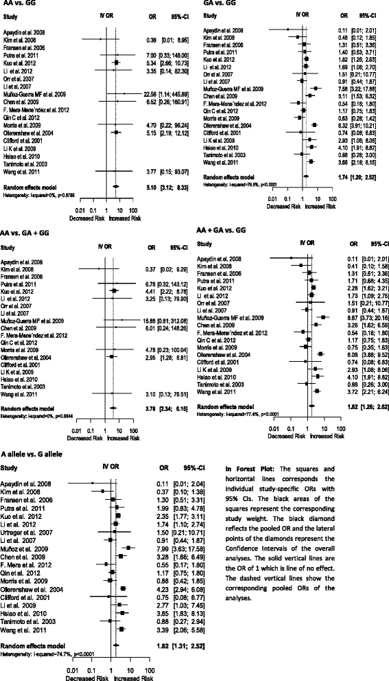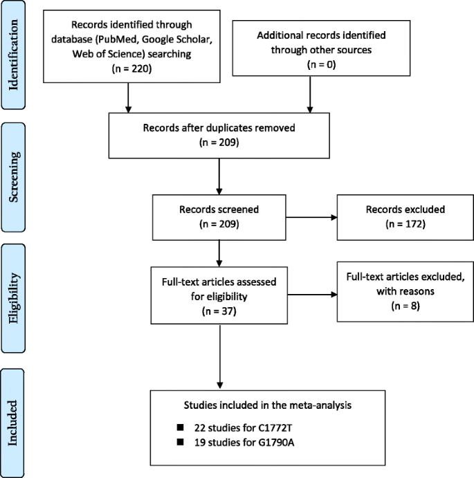 实验目的是系统检索并筛选符合标准的HIF1A多态性与癌症关联的病例对照研究及GWAS,确保纳入研究的质量与一致性。方法细节:检索PubMed、PubMed Central和Google Scholar数据库,时间范围为过去15年(截至2014年12月),检索词包括HIF1A、GWAS、SNPs、polymorphisms、C1772T、A1790G、case-control study、cancer;由两位研究者独立筛选文献,纳入标准为:病例对照研究或GWAS、研究人群明确、提供等位基因频率数据、发表于英文期刊;排除标准为:非人类研究、综述、编辑评论、未提供完整基因型数据的研究。结果解读:最终纳入22项1772 C/T多态性研究(包含8149例癌症患者和10875例对照)和19项1790 G/A多态性研究(包含4681例患者和5973例对照),涵盖前列腺癌、肺癌、肾细胞癌等10余种癌症类型,研究人群包括白种人、亚洲人及混合人群。