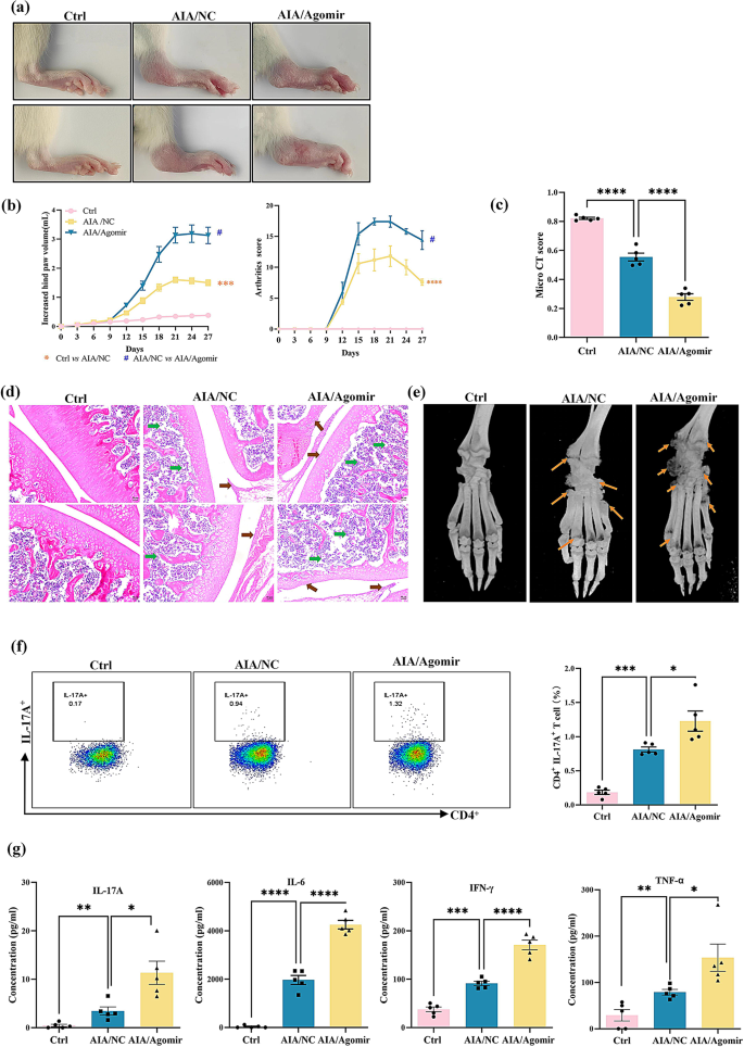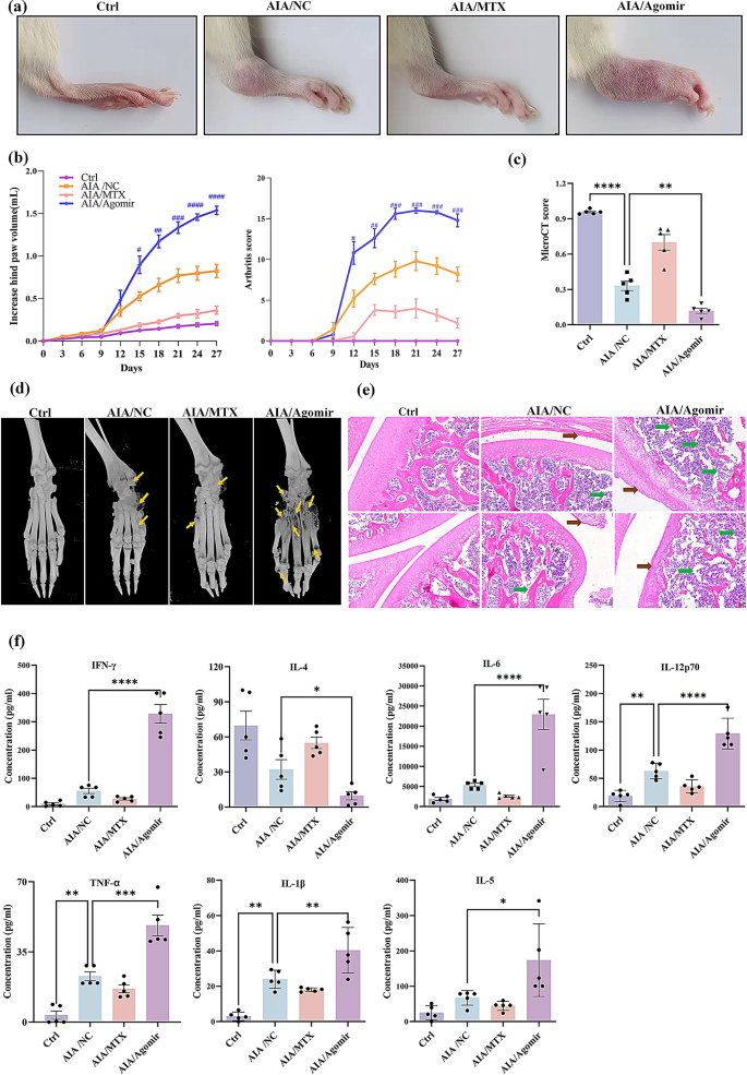 本环节核心目标是验证miR-542-5p过表达对RA病情的促进作用。研究构建SD大鼠佐剂诱导关节炎(AIA)模型,将大鼠分为健康对照组、AIA阴性对照组、AIA+甲氨蝶呤(MTX)组、AIA+miR-542-5p agomir组,每组5只;于建模第0天和第10天尾静脉注射agomir(20nmol/只),每3天记录大鼠后爪体积和关节炎评分,第27天处死大鼠取样本检测。结果显示,agomir组大鼠后爪体积、关节炎评分显著高于AIA阴性对照组(n=5,P<0.001);micro-CT扫描显示骨破坏程度更严重,H&E染色可见滑膜细胞增生、骨侵蚀等典型关节炎特征更显著;血清促炎因子TNF-α、IL-1β、IL-6等水平显著升高,抗炎因子IL-4水平显著降低(n=5,P<0.001)。