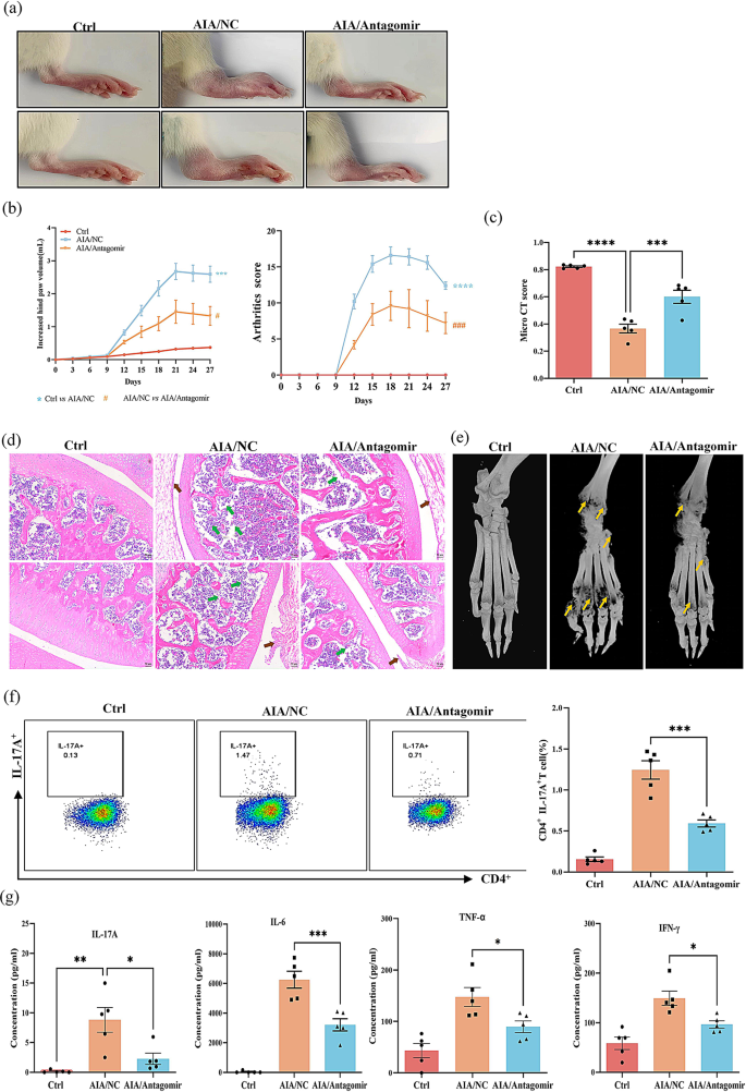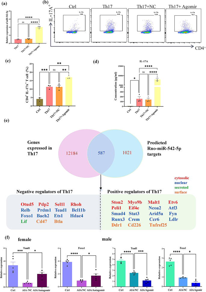 本环节核心目标是明确miR-542-5p调控RA性别差异的功能。研究将雌性AIA大鼠分为阴性对照组、miR-542-5p antagomir组,尾静脉注射antagomir(100nmol/只);雄性AIA大鼠分为阴性对照组、miR-542-5p agomir组,尾静脉注射agomir(20nmol/只);检测大鼠病情指标、Th17细胞比例、细胞因子水平。结果显示,雌性antagomir组大鼠后爪体积、关节炎评分显著降低(n=5,P<0.0001),Th17细胞比例、血清IL-17A浓度显著下降(n=5,P<0.001);雄性agomir组大鼠病情加重,Th17细胞比例、促炎因子水平显著升高(n=5,P<0.0001)。