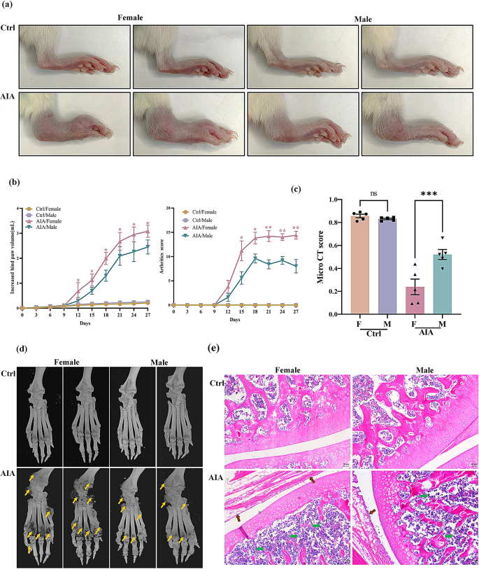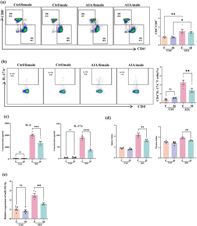 本环节核心目标是明确AIA大鼠的性别差异特征及与miR-542-5p的关联。研究将SD大鼠按性别分为健康对照组、AIA组,每组5只;检测大鼠后爪体积、关节炎评分、micro-CT评分,通过流式细胞术分析T细胞亚群比例,ELISA检测血清细胞因子水平,qRT-PCR检测miR-542-5p表达。结果显示,雌性AIA大鼠后爪体积、关节炎评分、micro-CT评分显著高于雄性AIA大鼠(n=5,P<0.01);H&E染色显示雌性大鼠滑膜增生、中性粒细胞浸润、骨破坏等病理特征更显著;流式细胞术分析发现雌性AIA大鼠Th17细胞比例显著高于雄性(n=5,P<0.01),血清IL-17A、IL-6浓度显著升高(n=5,P<0.0001);雌性AIA大鼠miR-542-5p表达水平显著高于雄性(n=5,P<0.01)。