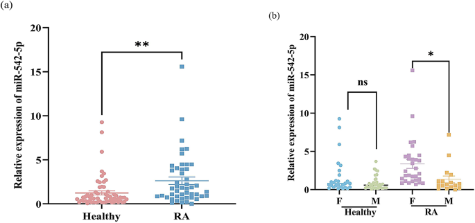 本环节核心目标是明确RA患者与健康人群、RA不同性别间miR-542-5p的表达差异。研究收集47例RA患者和61例健康人外周血样本,分离外周血单个核细胞(PBMCs),采用mirVana™ miRNA分离试剂盒提取总RNA,通过NanoDrop 2000c分光光度计验证RNA质量后,使用miDETECTA Track™ miRNA qRT-PCR试剂盒在BioRad IQ5系统上检测miR-542-5p表达水平,以Rnu6为内参,采用2^(-ΔΔCt)法计算相对表达量。结果显示,RA患者miR-542-5p表达水平显著高于健康人(n=108,P<0.01);RA女性患者miR-542-5p表达显著高于男性患者(n=47,P<0.05),而健康人群中无明显性别差异。