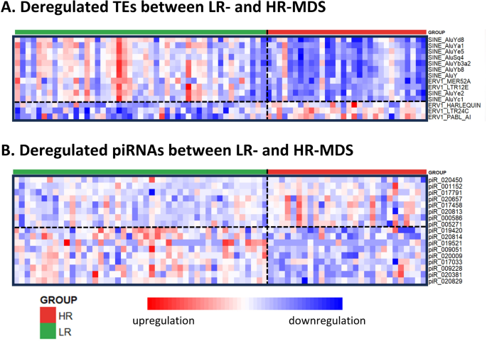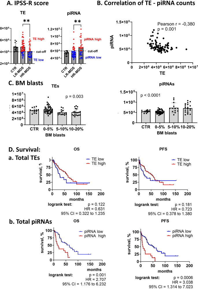 实验目的是全面解析CD34+细胞中转座子与piRNA的表达谱,筛选高低危MDS中的差异表达分子。方法细节:针对总RNA,采用RiboCop rRNA去除试剂盒去除核糖体RNA,通过NEBNext Ultra II Directional RNA文库制备试剂盒构建RNA-seq文库,在NovaSeq 6000平台进行双端测序;针对小RNA,采用QIAseq miRNA文库试剂盒构建小RNA-seq文库,进行单端测序。生物信息学分析方面,用SalmonTE工具识别并计数转座子,DESeq2进行差异表达分析;小RNA数据比对至piRNABank数据库,去重后进行差异分析。结果解读:MDS患者与对照样本中转座子和piRNA的整体表达谱相似,仅少数分子差异;但LR-MDS与HR-MDS间存在显著差异,共鉴定出106个差异表达转座子(48个上调、58个下调)和17个差异表达piRNA(7个上调、10个下调);进一步分析显示HR-MDS患者的总转座子表达水平显著低于LR-MDS及对照(p=0.005),总piRNA水平显著升高(p=0.003),二者呈中度负相关(Pearson r=-0.380,p=0.001),验证了转座子与piRNA的经典调控关系。