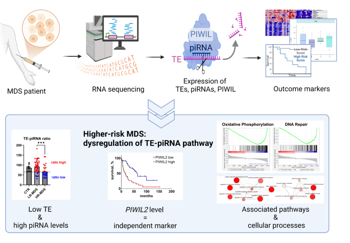 本研究聚焦于转座子-piRNA轴中的关键调控分子,成功筛选并验证了PIWIL2作为MDS的独立预后生物标志物,同时明确了转座子与piRNA的表达水平及比值与患者预后的关联。
