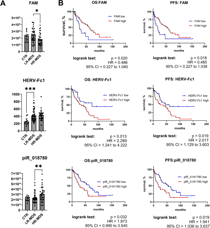 核心成果提炼:PIWIL2是MDS的独立预后生物标志物,其高表达提示患者预后不良,风险比HR=3.197(OS,95%CI=1.618-6.314,p=0.0008),HR=3.637(PFS,95%CI=1.771-7.470,p=0.0004);创新性在于首次发现PIWIL2在HR-MDS中的上调表达,明确其作为转座子-piRNA轴的关键调控因子,可用于MDS的预后分层,为MDS的表观遗传靶向治疗提供了潜在靶点;同时,本研究揭示的转座子下调与piRNA上调的协同失调,进一步完善了MDS进展的表观遗传调控机制。
