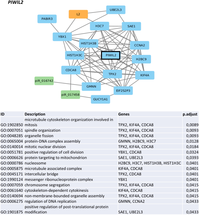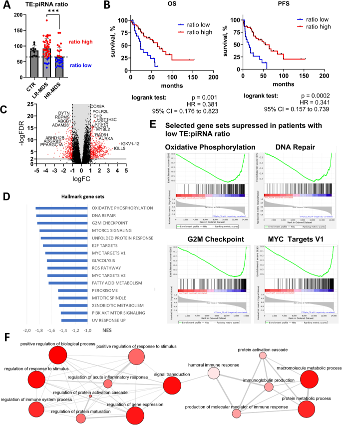 实验目的是解析转座子-piRNA轴失调对MDS细胞功能的影响,明确下游调控通路。方法细节:基于转座子与piRNA的比值将患者分为低比值组(低转座子、高piRNA)和高比值组,通过差异表达分析筛选两组间的蛋白编码基因,采用基因集富集分析(GSEA)和GO富集分析探索失调的生物学通路;同时构建PIWIL2等关键分子的共表达网络,分析其功能关联。结果解读:低比值组样本中,氧化磷酸化、糖酵解、细胞周期、DNA修复、免疫应答等通路被显著抑制,提示高危MDS细胞的代谢活性、增殖能力及免疫功能均出现异常;PIWIL2的共表达网络主要与细胞分裂、染色体分离、核小体组装等过程相关,其网络中的基因(如HIST1H3B、CCNA2)与低比值组中的下调基因重叠,进一步验证了PIWIL2在MDS进展中的调控作用。