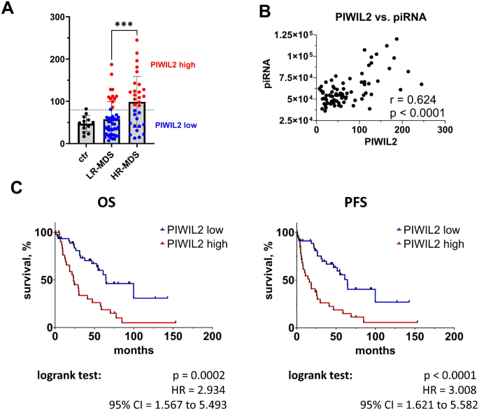 研究过程详述:PIWIL2的来源为MDS患者CD34+骨髓造血干细胞,验证方法包括RNA-seq、实时定量PCR及液滴数字PCR;特异性方面,PIWIL2在HR-MDS中的表达水平较LR-MDS升高2倍(p<0.001),与总piRNA水平呈强正相关(Pearson r=0.624,p<0.001);敏感性方面,在训练队列中,高PIWIL2表达患者的中位OS为23.5个月,低表达患者为64.7个月(HR=2.934,95%CI=1.567-5.493,p=0.0002);独立队列中,高表达患者的中位OS为12.2个月,低表达为50.9个月(HR=3.379,95%CI=1.364-8.372,p<0.0001),显示出良好的预后预测能力。