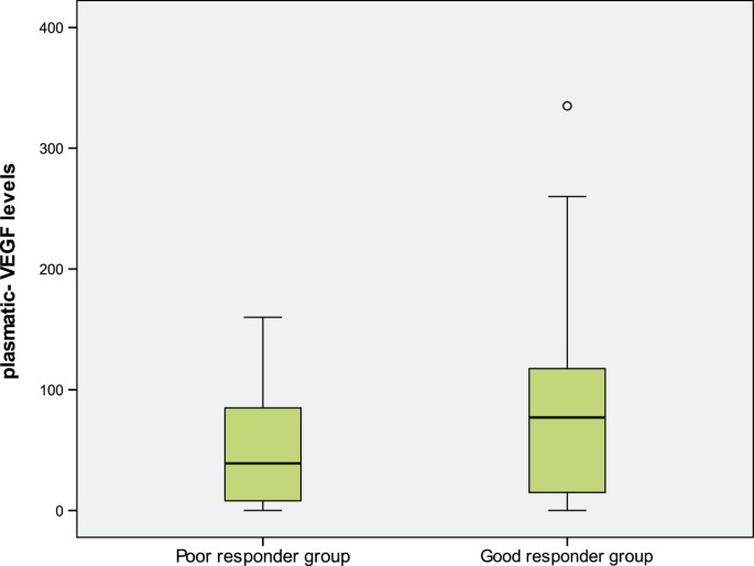 ;治疗前良好应答者的平均血清血管内皮生长因子水平为86.61±80.30pg/ml,高于不良应答者的47.12±45.74pg/ml,差异接近统计学显著性(n=68,p=0.086)
