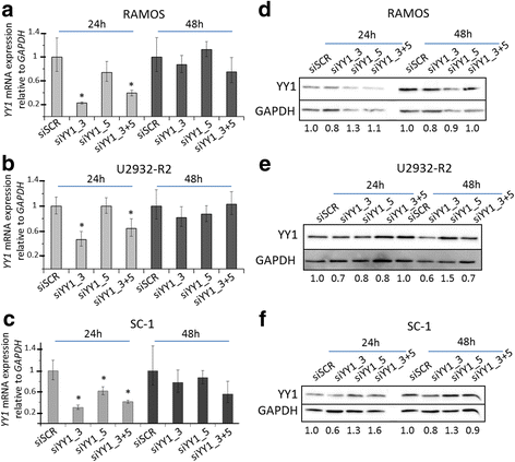 实验目的是排除全局抑制剂的非特异性影响,直接验证YY1 mRNA敲低对蛋白水平的影响。方法细节为选取RAMOS、U2932-R2、FL细胞系SC-1,通过核转染法转染两种靶向YY1的小干扰RNA(siRNA)及阴性对照siRNA,转染后24h和48h分别用qRT-PCR检测YY1 mRNA水平,用免疫印迹检测蛋白水平;采用Student’s t-test分析统计学显著性。结果解读:转染24h后,两种siRNA均显著敲低了YY1 mRNA水平(P<0.05),其中siYY1_3的敲低效果最显著,但YY1蛋白水平仅出现轻微变化,未呈现与mRNA水平一致的下降趋势,进一步验证了YY1蛋白的高度稳定性,其水平不受短期mRNA变化的影响。