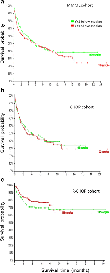 实验目的是明确YY1 mRNA水平与B-NHL患者预后的关系,验证现有基于mRNA的研究结论。方法细节为利用两个公开的DLBCL患者队列数据(MMML队列n=399、CHOP治疗队列n=181、R-CHOP治疗队列n=233),按YY1 mRNA表达水平的中位数将患者分为高表达组和低表达组,采用Kaplan-Meier法进行生存分析。结果解读:生存分析结果显示,无论患者接受CHOP还是R-CHOP治疗,YY1 mRNA高表达组与低表达组的生存率均无显著差异,提示YY1 mRNA不能作为DLBCL患者的预后标志物,进一步支持了细胞系实验的结论,即转录本水平无法反映YY1的功能状态。