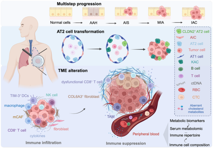 核心成果方面,本文献总结的生物标志物具有重要的功能关联与创新性,例如首次在早期肺腺癌中发现KRT8+肺泡中间细胞是AT2细胞向恶性细胞转化的中间亚群,其存在与更差的生存率相关;首次将TIM-3定位为肺腺癌癌前拦截的潜在生物标志物,为早期干预提供了靶点;发现亮氨酸富含α-2-糖蛋白1(LRG1)是转移相关的血管生物标志物,可通过信号转导与转录激活因子3(STAT3)依赖的方式被内皮细胞上调,促进转移前生态位的形成。这些生物标志物不仅揭示了肺癌进化的分子机制,还为早期检测、精准分型、预后预测与治疗方案优化提供了可靠的依据,例如基于多组学的亚型分类可指导小细胞肺癌患者的靶向治疗选择,代谢重编程生物标志物为耐药肺癌患者提供了新的治疗靶点。