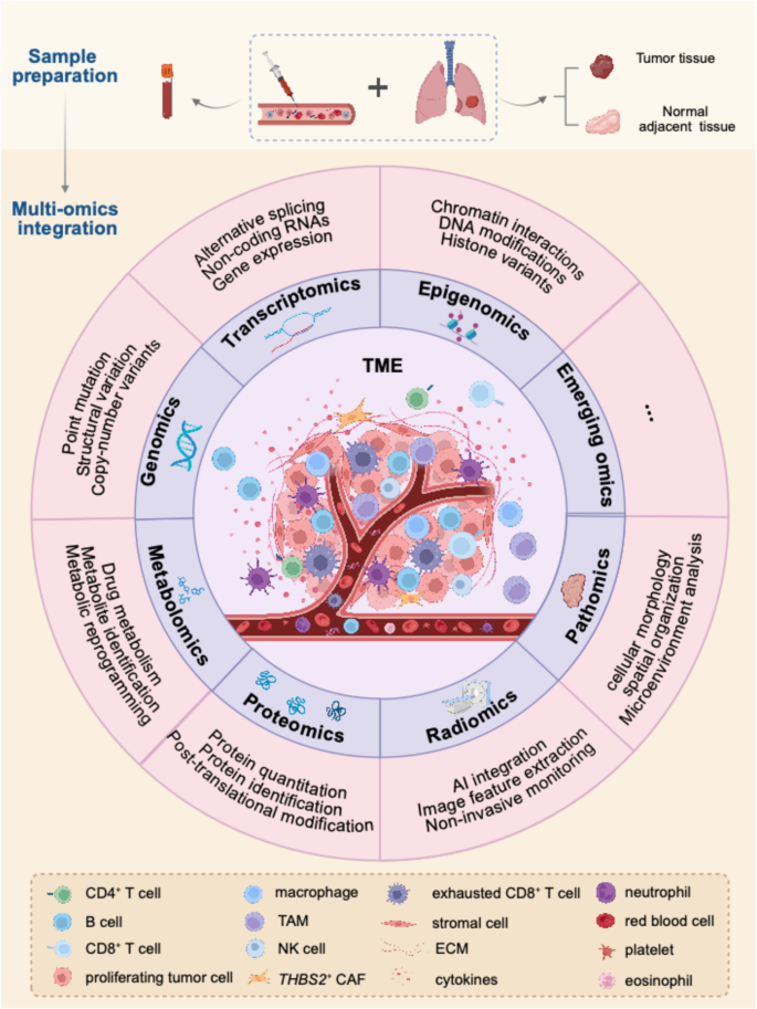 实验目的是总结多组学方法在肺癌诊断、治疗、预后中的转化应用价值,为精准诊疗提供生物标志物与策略支持。方法细节为从诊断分型、早期检测、治疗耐药、预后预测四个方向,回顾多组学在临床转化中的研究成果。结果解读显示,在诊断分型上,多组学将小细胞肺癌分为4个分子亚型(NMF1-4),每个亚型具有独特的分子特征与治疗脆弱性,例如NMF1亚型具有高细胞周期与DNA损伤特征,对DNA损伤靶向治疗敏感;非小细胞肺癌则被分为5个多组学亚型,包括代谢型、肺泡样型、增殖型、缺氧/间质型、免疫原性型,各亚型的预后与治疗反应存在显著差异。在早期检测上,PulmoSeek Plus模型整合临床特征、放射组学数据与循环游离DNA(cfDNA)甲基化生物标志物,在联合队列中的曲线下面积(AUC)为0.90,敏感性0.88,特异性0.98;基于全基因组测序的cfDNA片段组学、基因组学与甲基组学整合模型在多中心验证队列中的AUC达0.912,特异性96.3%。在治疗耐药解析上,整合RNA测序与液相色谱-串联质谱仪发现乙酰胆碱代谢是EGFR酪氨酸激酶抑制剂(TKI)治疗耐药的生物标志物,乙酰胆碱在耐药持续细胞中积累,通过毒蕈碱受体3(M3R)激活WNT信号通路,而FDA批准的M3R抑制剂达非那新可显著减少体内肿瘤复发;整合全外显子测序、RNA测序与单细胞RNA测序还发现,程序性死亡配体1(PD-L1)阻断治疗的获得性耐药与γ干扰素(IFNγ)、氧化磷酸化(OXPHOS)和DNA修复通路的基因表达升高及肿瘤微环境慢性炎症状态相关。在预后预测上,整合全外显子测序与RNA测序发现B细胞易位基因2(BTG2)是早期非小细胞肺癌的稳定预后生物标志物,其表达与更好的生存率相关,风险比(HR)为0.28-0.68(文献未明确提供样本量,基于多队列整合分析);整合单细胞RNA测序与空间转录组学还发现,神经内分泌特征低的小细胞肺癌与免疫浸润(包括M1/M2样巨噬细胞、B细胞、CD4+/CD8+T细胞)相关,预后更好。产品关联:文献未提及具体实验产品,领域常规使用数字甲基化特异性PCR平台、电子鼻、人工智能医学影像分析系统等进行早期检测与分型。