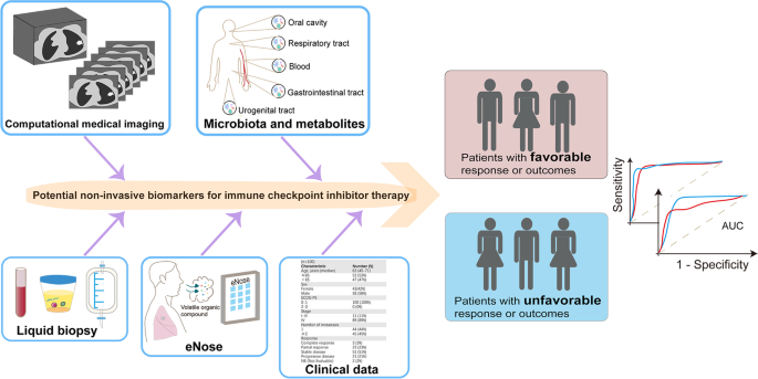 针对这一研究空白,本文系统综述了近年肿瘤ICI治疗领域中具有临床应用潜力的非侵入性生物标志物,涵盖医学影像组学、液体活检、微生物组及代谢物、电子鼻、临床特征等多个维度,为临床精准筛选ICI获益人群、优化治疗决策提供了全面的参考依据。