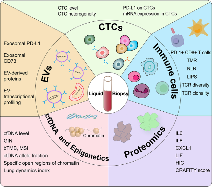 方法细节:系统检索近年基于血液样本的ICI疗效预测研究,按标志物类型(CTC、循环免疫细胞、cfDNA、蛋白质组、外泌体)整理分析,重点关注具有统计学显著性的预测指标与cutoff值。