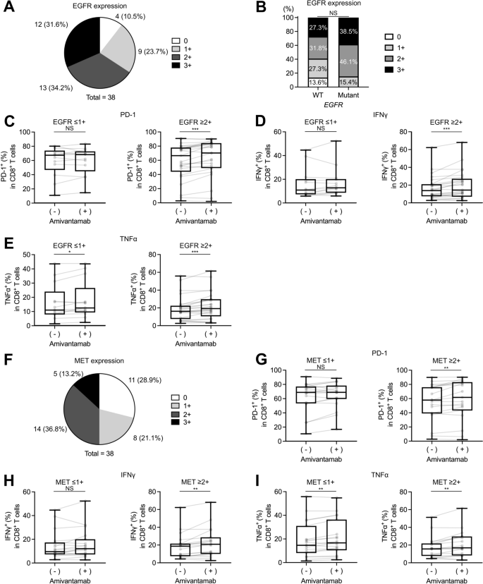 本环节的核心目标是明确EGFR、MET蛋白表达水平对埃万妥单抗免疫激活效应的预测价值,挖掘可用于临床分层的生物标志物。实验通过免疫组化对EGFR、MET蛋白表达进行半定量评分,其中EGFR评分标准为≥10%肿瘤细胞出现中等及以上膜染色定义为高表达(≥2+),MET评分标准为≥50%肿瘤细胞出现中等及以上膜染色定义为高表达(≥2+),分层分析不同表达组的埃万妥单抗免疫调控效应差异。实验结果对应表达分层分析图显示,38例可评估样本中EGFR高表达占比66%(25/38),其中85%的EGFR突变样本为EGFR高表达,同时59%的EGFR野生型样本也呈EGFR高表达;MET高表达占比50%(19/38)。在EGFR高表达组中,埃万妥单抗可显著上调CD8+T细胞的程序性死亡受体1表达、干扰素-γ和肿瘤坏死因子-α分泌(n=25,P<0.05),并促进树突状细胞成熟,而EGFR低表达组中上述效应不显著;MET高表达组中同样观察到埃万妥单抗诱导的CD8+T细胞激活效应显著增强(n=19,P<0.05),MET低表达组中效应不显著。进一步将样本分为EGFR或MET至少一个高表达组和两者均低表达组,结果显示至少一个高表达组中埃万妥单抗的免疫激活效应显著,而两者均低表达组中无显著变化,提示EGFR或MET蛋白高表达可作为埃万妥单抗免疫激活效应的预测标志物。