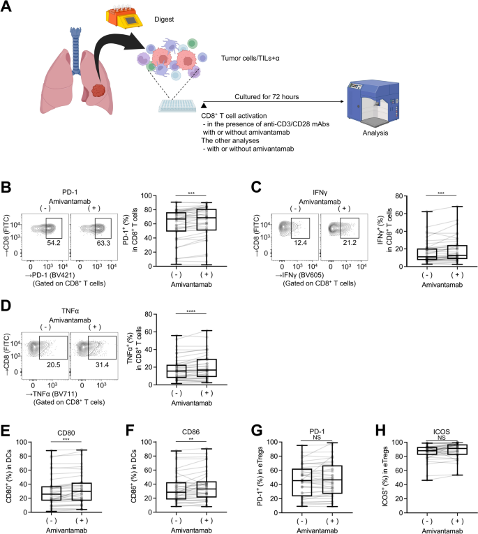 本环节的核心目标是建立人新鲜非小细胞肺癌样本的体外肿瘤浸润淋巴细胞共培养体系,直接评估埃万妥单抗的免疫调控效应。实验方法为将新鲜肿瘤制备的单细胞悬液接种于添加10%AB血清的RPMI-1640完全培养基中,分为不同处理组:CD3/CD28抗体刺激组、CD3/CD28抗体联合埃万妥单抗(0.5μg/mL)处理组,培养72小时后通过流式细胞术检测免疫细胞表型及细胞因子表达;其中树突状细胞及效应调节性T细胞的表型分析在无CD3/CD28刺激的条件下进行,以排除非特异性激活的干扰。实验结果对应流式细胞术分析图显示,埃万妥单抗处理后CD8+肿瘤浸润淋巴细胞的程序性死亡受体1表达、干扰素-γ分泌、肿瘤坏死因子-α分泌均显著升高,树突状细胞的CD80、CD86表达显著上调,而效应调节性T细胞的程序性死亡受体1、可诱导共刺激分子表达无显著变化(n=40,P<0.01),证实埃万妥单抗可直接激活人非小细胞肺癌中的抗肿瘤免疫应答。