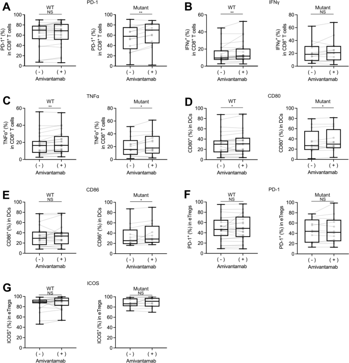 本环节的核心目标是验证埃万妥单抗的免疫激活效应是否仅局限于EGFR突变型非小细胞肺癌,明确其适用人群范围。实验根据临床常规检测的EGFR突变结果将样本分为EGFR突变组(13例)和EGFR野生型组(24例,3例未开展EGFR突变检测),分别分析两组经埃万妥单抗处理后的免疫细胞表型变化。实验结果对应分层分析图显示,EGFR突变组中埃万妥单抗可显著上调CD8+T细胞的程序性死亡受体1表达、干扰素-γ和肿瘤坏死因子-α分泌,同时促进树突状细胞CD80、CD86表达(n=13,P<0.05);而EGFR野生型组中同样观察到CD8+T细胞细胞因子分泌及树突状细胞成熟的显著上调(n=24,P<0.05),两组的效应调节性T细胞表型均无显著变化,提示埃万妥单抗的免疫激活效应不受EGFR突变状态的限制,EGFR野生型患者也可能从其治疗中获益。