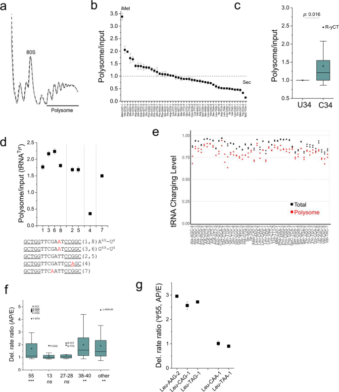 结果解读:多聚体中转运RNA的丰度分布呈现显著偏好性,起始甲硫氨酸转运RNA显著富集,而硒代半胱氨酸转运RNA显著缺失; wobble位为胞嘧啶34的转运RNA异构体整体比尿嘧啶34的异构体更富集于多聚体(对应图5b-c)。转运RNA异构体的核糖体结合效率存在差异,如酪氨酸转运RNA的不同异构体仅因单核苷酸差异就呈现出显著的结合丰度差异(对应图5d)。比较A/P位点与E位点的转运RNA修饰水平发现,假尿苷55、假尿苷38-40及可变环区假尿苷位点在A/P位点的水平显著高于E位点,而假尿苷13、假尿苷27-28无显著差异(对应图5f),提示这些位点的假尿苷修饰可能促进转运RNA的核糖体A位点加载或减慢E位点释放。