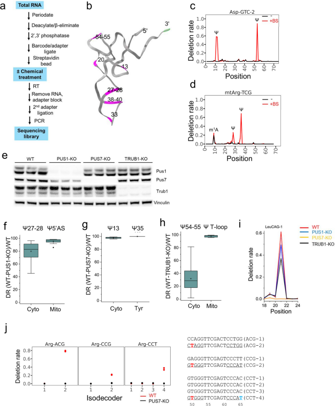结果解读:免疫印迹结果显示三种合成酶的敲除效率符合实验要求(对应图1e)。亚硫酸氢盐处理可特异性检测转运RNA上的假尿苷位点,如胞质天冬氨酸转运RNA(GUC)-2的假尿苷13、假尿苷55位点,线粒体精氨酸转运RNA的假尿苷29、假尿苷36位点均显示出显著的处理依赖性缺失信号(对应图1c、1d)。通过敲除细胞系验证,明确了假尿苷合成酶1负责催化胞质转运RNA 5’反密码子茎区及线粒体转运RNA的假尿苷位点,敲除后该区域假尿苷的缺失率平均超过80%(n=28,P<10^-4);假尿苷合成酶7负责催化D茎区假尿苷13及酪氨酸转运RNA的假尿苷35位点,敲除后该类位点缺失率接近100%(n=21,P<10^-4);TruB同源假尿苷合成酶1负责催化T环区假尿苷54-55位点,敲除后胞质转运RNA该区域假尿苷缺失率约30%,线粒体转运RNA该区域缺失率接近100%(n=55,P<10^-3)(对应图1f-h)。此外还发现假尿苷合成酶7可催化D环区假尿苷20c及T茎区假尿苷50等未被充分表征的位点(对应图1i-j)。