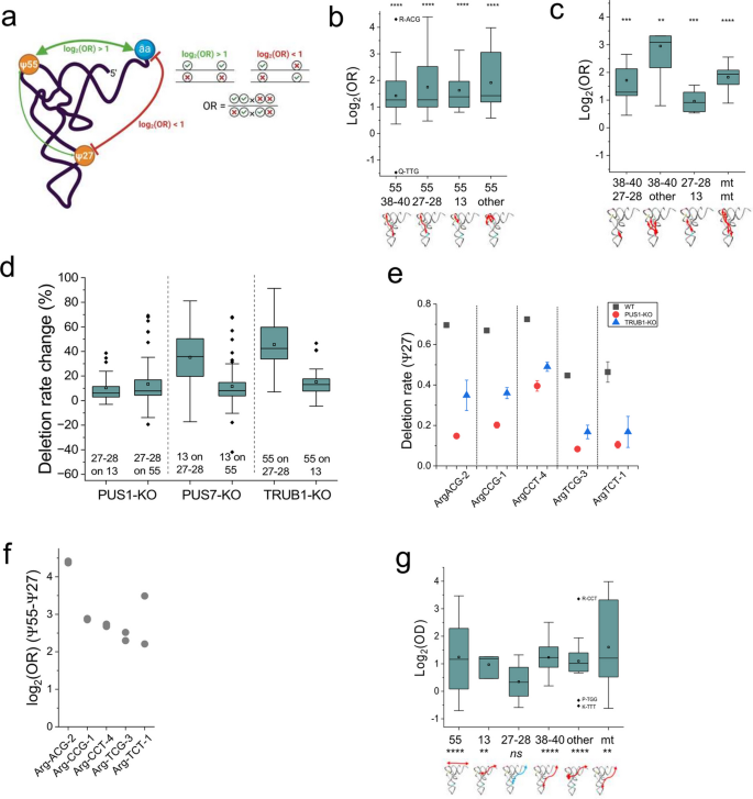 结果解读:全局分析显示假尿苷修饰间普遍存在正互作,其中T环区假尿苷55与其他区域的假尿苷位点(3’反密码子茎环区假尿苷38-40、5’反密码子茎区假尿苷27-28、D茎区假尿苷13等)均呈现显著正互作(log₂(比值比)>0,P<0.05)(对应图4b),其他区域的假尿苷位点间也以正互作为主(对应图4c)。敲除单一假尿苷合成酶会同时降低其他合成酶催化位点的假尿苷修饰水平,如TruB同源假尿苷合成酶1敲除会显著降低假尿苷27-28的修饰水平(对应图4d-e),验证了正互作的存在。推测:这种协同调控可能由La核糖核蛋白结构域家族成员3(LARP3)介导的多合成酶复合物实现。此外,假尿苷修饰与转运RNA氨酰化水平整体呈正相关,其中假尿苷38-40、假尿苷55等位点的正互作最为显著,而假尿苷27-28位点与氨酰化无显著关联,这与氨酰-转运RNA合成酶的识别元件分布一致(对应图4g)。