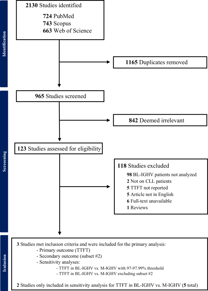 实验目的是获取符合纳入标准的BL-IGHV相关研究,构建可用于统一分析的临床队列。方法细节为严格遵循PRISMA指南进行文献检索,去除重复记录后通过标题、摘要和全文筛选,最终纳入3项符合标准的回顾性研究,整合得到包含122例BL-IGHV、1274例M-IGHV、760例U-IGHV患者的合并队列。结果解读:通过PRISMA文献筛选流程图(Fig.1)清晰展示了从2130条初始记录到最终3项研究的筛选过程,最终构建的合并队列覆盖了不同研究的患者群体,具备较好的代表性,为后续荟萃分析奠定了基础。