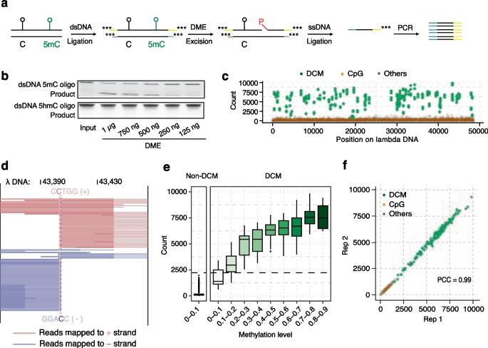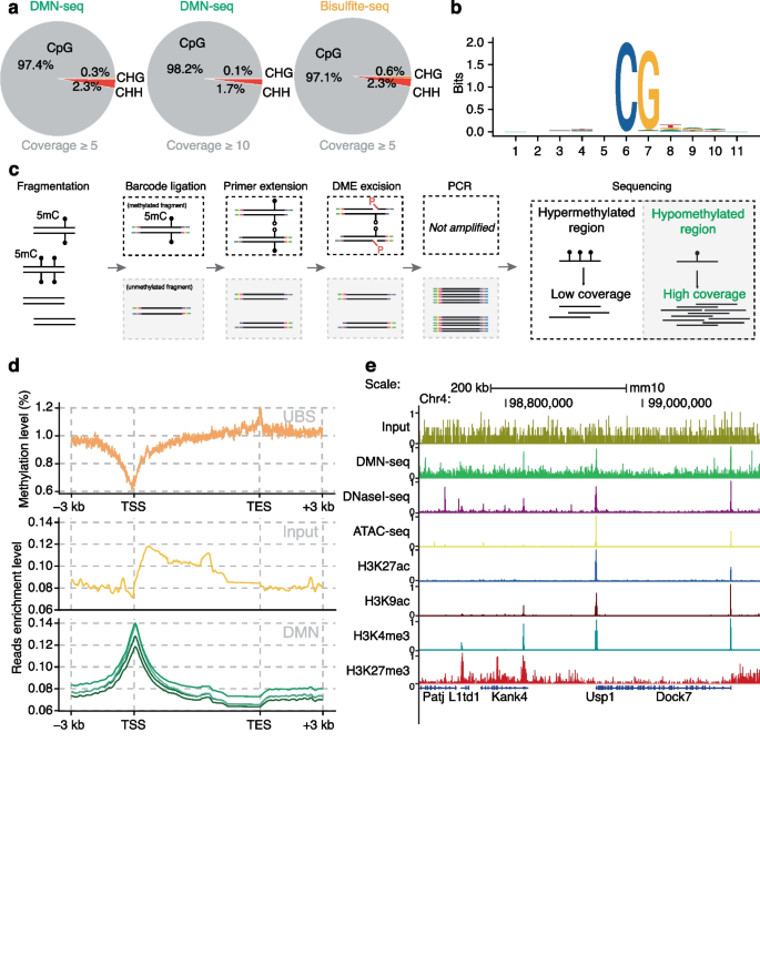 实验目的是验证DMN+方法能否实现单碱基分辨率的5mC检测。方法细节为:将λ-DNA或小鼠胚胎干细胞(mESC)基因组DNA(gDNA)片段化,连接含硫代磷酸酯修饰的定制接头,通过酶切去除未成功连接的片段及含游离5"-磷酸的片段,然后用DME酶处理,仅含5mC的片段会产生游离5"-磷酸,进而连接单链接头,最后通过PCR扩增构建测序文库。结果解读:DMN+文库能精准检测λ-DNA中部分甲基化的DCM基序位点,与超快速亚硫酸氢盐测序(UBS-seq)结果高度相关,技术重复的Pearson相关系数达0.99(图1f);在mESC样本中,97%以上检测到的5mC位点为CpG基序,与BS-seq结果一致(图2a),证明DMN+具有单碱基分辨率的5mC检测能力,且准确性高、重复性好。实验所用关键产品:NEB的NEBNext dsDNA Fragmentase、IDT的定制接头、Illumina的NovaSeqX测序平台。