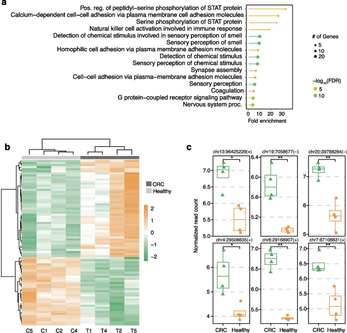 实验目的是验证DMN-在临床肿瘤样本中的应用价值,发现结直肠癌(CRC)相关的低甲基化生物标志物。方法细节为:收集6对CRC肿瘤与癌旁正常组织gDNA,构建DMN-文库,同时用简化代表性亚硫酸氢盐测序(RRBS)作为对照,分析差异甲基化区域(DMRs)及相关功能通路。结果解读:肿瘤样本中低甲基化区域显著多于癌旁组织(图3a),功能富集分析显示低甲基化区域关联的通路包括JAK-STAT信号通路(与肿瘤细胞增殖、免疫逃逸相关)、感觉感知通路(与CRC代谢异常相关)(图4a);进一步筛选出MBD3L3、OR2J2等潜在生物标志物,其中MBD3L3参与异染色质形成,是CRC的潜在预后标志物,OR2J2属于嗅觉受体家族,与CRC的预后及治疗相关(图4b、c)。实验所用关键产品:Qiagen的AllPrep DNA/RNA/miRNA Universal Kit、Zymo Research的Zymo-seq RRBS Library Kit。