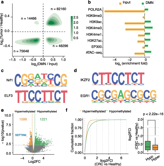 Biomarker的来源为CRC患者的肿瘤组织gDNA与血浆cfDNA。验证方法包括:DMN-测序结合RRBS验证差异甲基化区域,功能富集分析明确基因功能,低输入cfDNA测序验证可检测性。特异性与敏感性数据:在CRC组织样本中,差异低甲基化区域的log2倍数变化(log2FC)绝对值显著高于高甲基化区域(图3f),样本量n=6对;在0.1ng低输入cfDNA中,DMN-仍能稳定检测到低甲基化区域,与高输入样本的相关性高(图5a)。