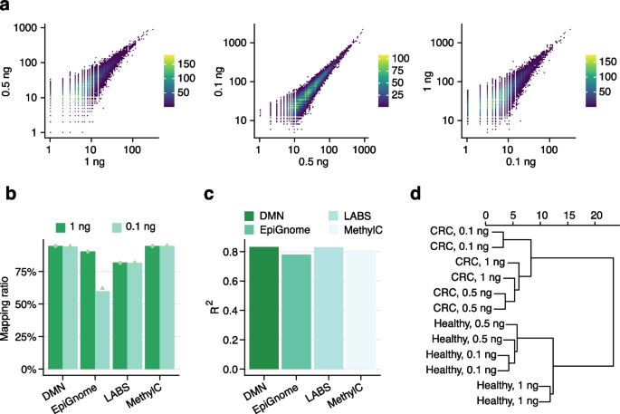 实验目的是验证DMN-在低输入cfDNA中的敏感性与可靠性。方法细节为:取1ng、0.5ng、0.1ng的CRC患者与健康对照cfDNA,构建DMN-文库,与现有低输入测序方法(LABS-seq、MethylC-seq、EpiGnome)的结果进行对比。结果解读:不同输入量的样本测序结果相关性高,即使在0.1ng低输入下仍能稳定检测低甲基化区域(图5a);DMN-的mapping率与现有方法相当,基因组范围内的相关性也与现有方法一致(图5b、c);样本聚类分析显示,样本按疾病状态聚类而非输入量,证明DMN-能有效捕获生物学信号,技术重复性好(图5d)。实验所用关键产品:Qiagen的QIAamp Circulating Nucleic Acid Kit、Illumina的NovaSeqX测序平台。