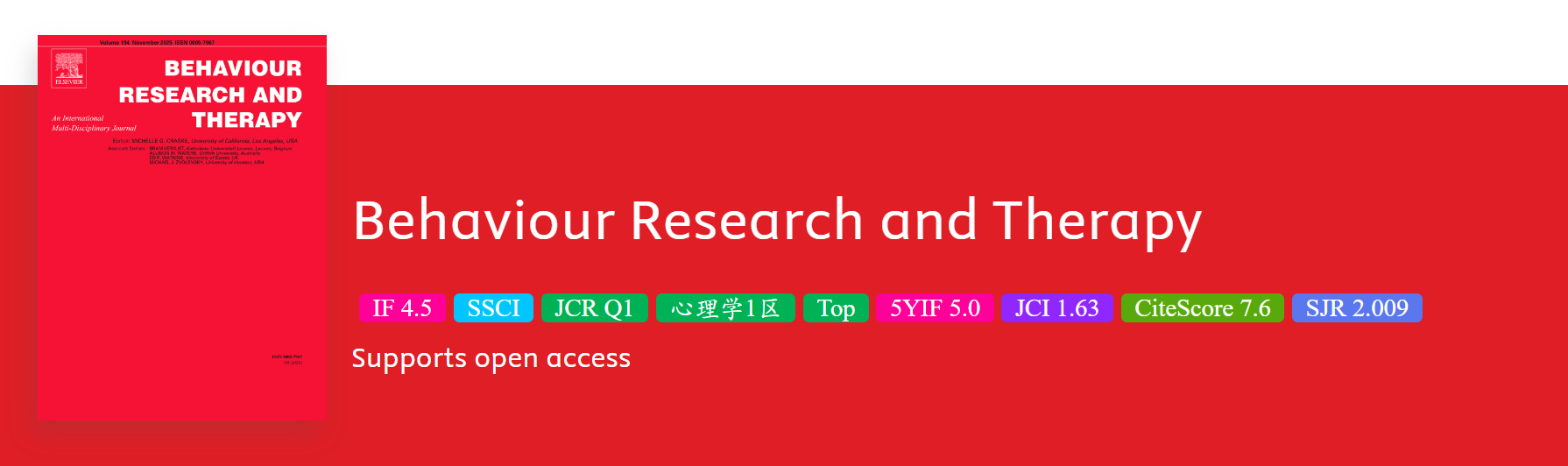 《Behaviour Research and Therapy》(简称BRT)由Elsevier出版,创刊于1963年,是行为科学与临床心理学领域的权威期刊,核心定位为“连接基础行为机制与临床干预的桥梁期刊”。其收稿特色在于实证研究导向,偏好包含随机对照试验(RCT)、纵向追踪数据或机制验证(如神经影像学/生理指标)的原创论文,同时接收高质量系统综述与元分析(占比约15%)。该期刊非Mega Journal,2024年发文量约650篇,聚焦深度而非广度。
