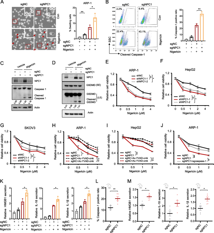 方法:对NPC1敲低/敲除的ARP-1、HepG2细胞,用焦亡诱导剂nigericin(MCE,HY-127019)处理,通过相差显微镜观察细胞肿胀(焦亡特征)、Western blot检测焦亡标志物(cleaved caspase-1、cleaved GSDMD)、流式细胞术检测PI阳性细胞(细胞死亡);同时用caspase-1抑制剂Ac-YVAD-cmk(MCE,HY-16990)或caspase-1敲除验证焦亡通路的必要性。