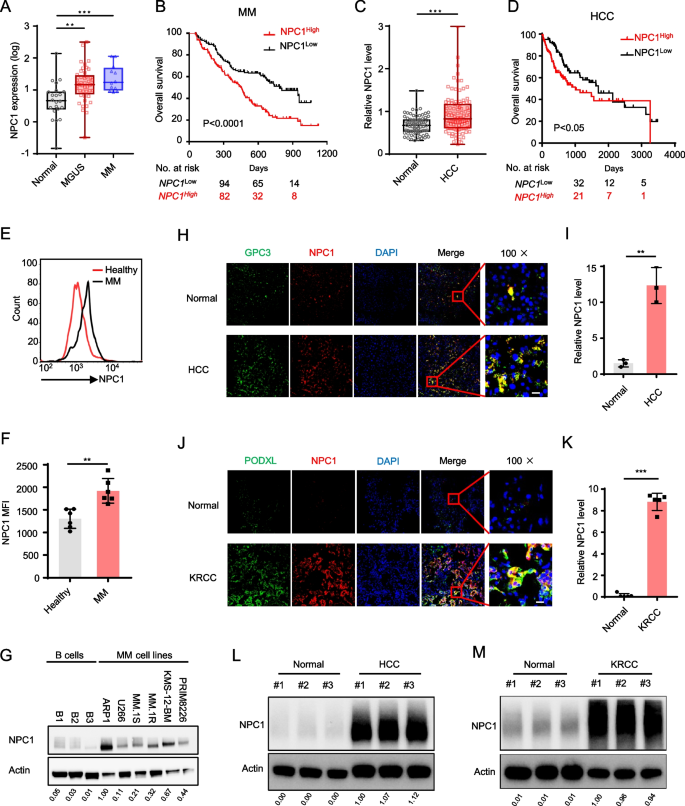 方法:分析Zhan多发性骨髓瘤(MM)数据集(健康对照n=22、MGUS n=44、MM n=12)、GEO Chen肝癌数据集(正常肝组织n=76、肝细胞癌HCC n=104)及TCGA多癌种数据,评估NPC1 mRNA表达与患者生存的关系;通过免疫荧光、Western blot及流式细胞术,验证临床MM样本(健康供体n=6、MM患者n=6)、MM细胞系(ARP-1、RPMI-8226)及实体瘤样本(HCC、肾细胞癌KRCC)的NPC1蛋白表达。