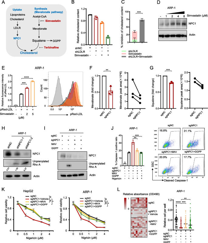 方法:整合NPC1关联胆固醇代谢基因与焦亡相关基因,筛选到甲羟戊酸(MVA)通路(合成胆固醇与香叶基香叶基焦磷酸GGPP);用simvastatin(MVA通路抑制剂,MCE,HY-17502)处理细胞,检测GGPP水平及RhoA prenylation(Western blot检测未prenylated RhoA);回补MVA(Sigma,43987)或GGPP(Sigma,G6025),检测cleaved caspase-1表达及细胞活力。