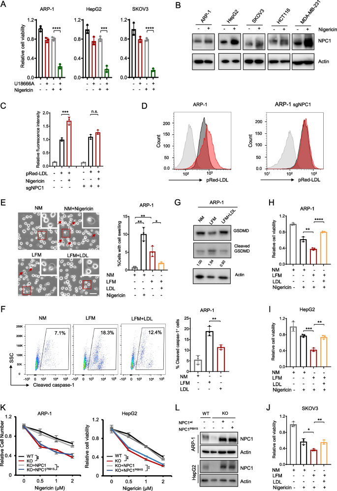 方法:用NPC1抑制剂U18666A(MCE,HY-107433)处理细胞,检测nigericin敏感性;用脂质-free培养基(LFM)培养ARP-1、HepG2细胞,回补LDL(Invitrogen,L3486)或野生型/突变型NPC1(P691S,胆固醇转运缺陷),检测细胞肿胀、cleaved GSDMD表达及细胞活力。