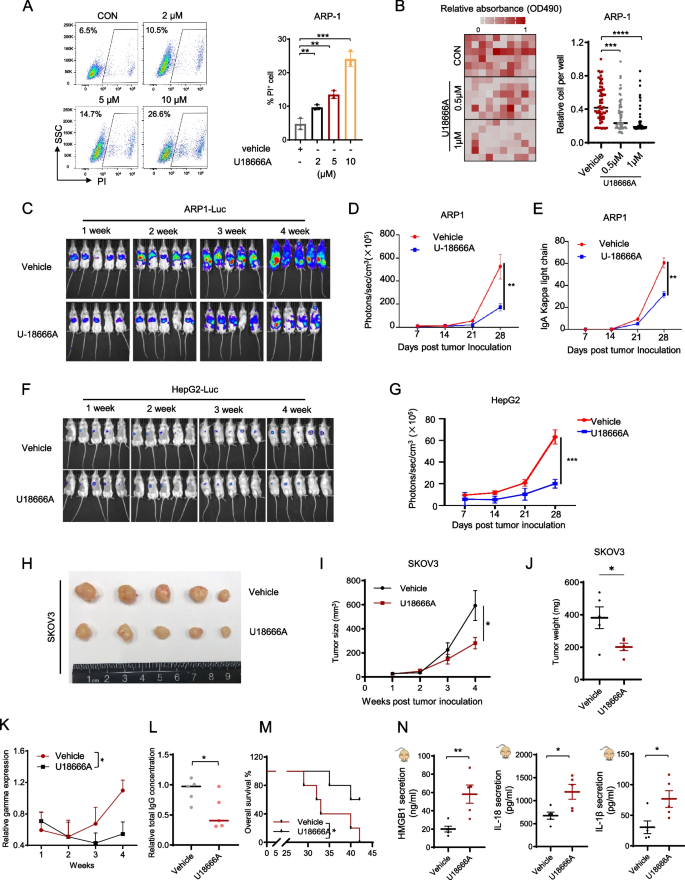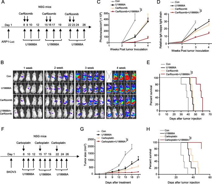 方法:用U18666A单药或联合化疗(carfilzomib、epirubicin、carboplatin)处理细胞,检测细胞活力;构建异种移植瘤模型(ARP-1、HepG2、SKOV3)及自发MM模型(VkMYC小鼠),评估U18666A的体内疗效(肿瘤负荷、生存期、血清IgG水平)。