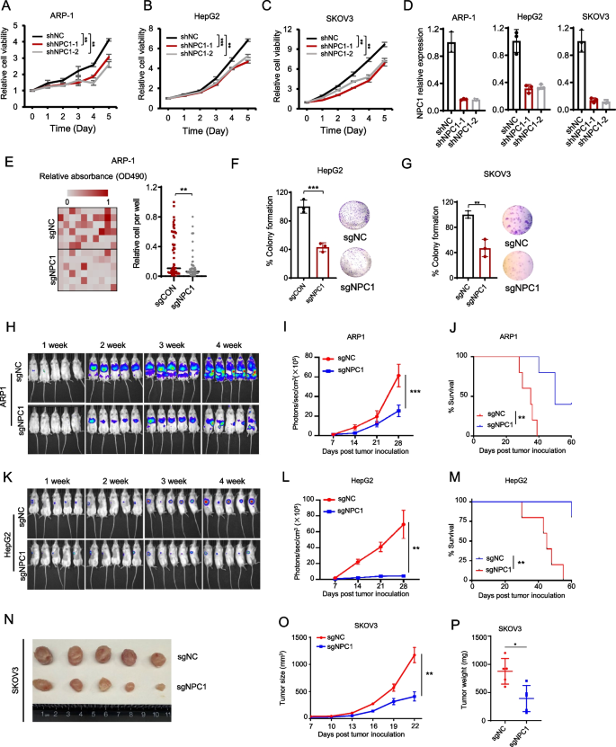 结果:NPC1敲低/敲除显著抑制ARP-1、HepG2、SKOV3细胞活力(ARP-1 shNPC1 vs shNC,P<0.01)及克隆形成能力;动物模型中,NPC1缺失显著降低肿瘤负荷(ARP-1模型:sgNPC1组生物发光信号较sgNC组降低70%,n=5,P<0.001),延长生存期(ARP-1模型:sgNPC1组中位生存期56天vs sgNC组32天,P<0.01)。