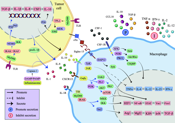 - 免疫抑制介导:TAMs分泌细胞因子(IL-1、IL-8、IL-10、M-CSF、TGF-β)和外泌体,诱导M2极化、招募MDSCs/Tregs、抑制效应T细胞功能。例如,IL-8通过CXCR1/2-STAT3通路促进M2极化,IL-10通过JAK1/STAT3通路增强免疫抑制。