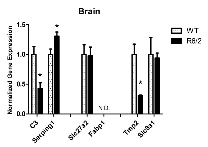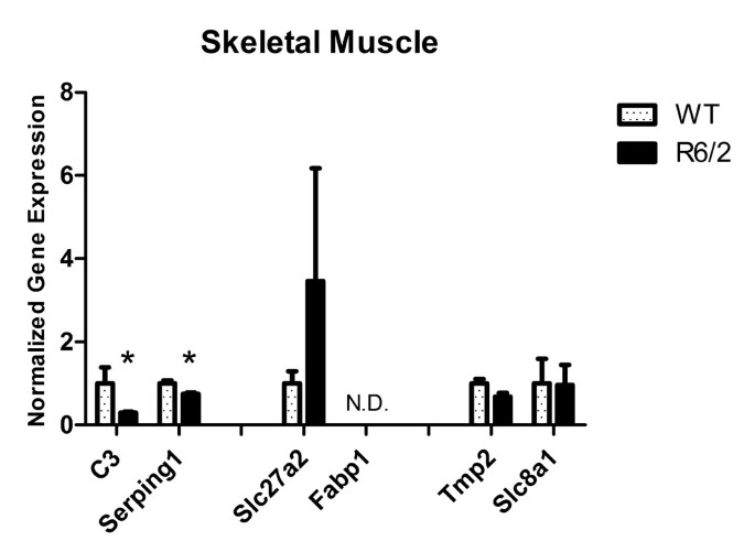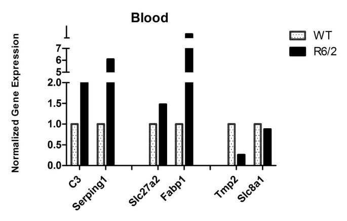 方法细节:首先将R6/2和WT的血液RNA分别混合成Pooled样本(消除个体差异),用QuantiTect Reverse Transcription kit反转录为cDNA;对于肌肉、皮肤和脑样本,每个样本单独反转录。随后,用CFX96实时PCR系统(Bio-Rad)和iQ SYBR Green master mix,对候选基因(补体与凝血 cascade的C3、Serping1;PPAR信号的Fabp1、Slc27a2;心肌相关的Tpm2、Slc8a1)进行RT-qPCR检测。血液样本的表达数据归一化至Ppib、Actb、Ywhaz、Rpl13a的几何均值,其他组织归一化至Actb、B2m、Hprt、Rpl13a(骨骼肌排除Actb)。统计学分析采用Student’s t-test(p<0.05为显著)。